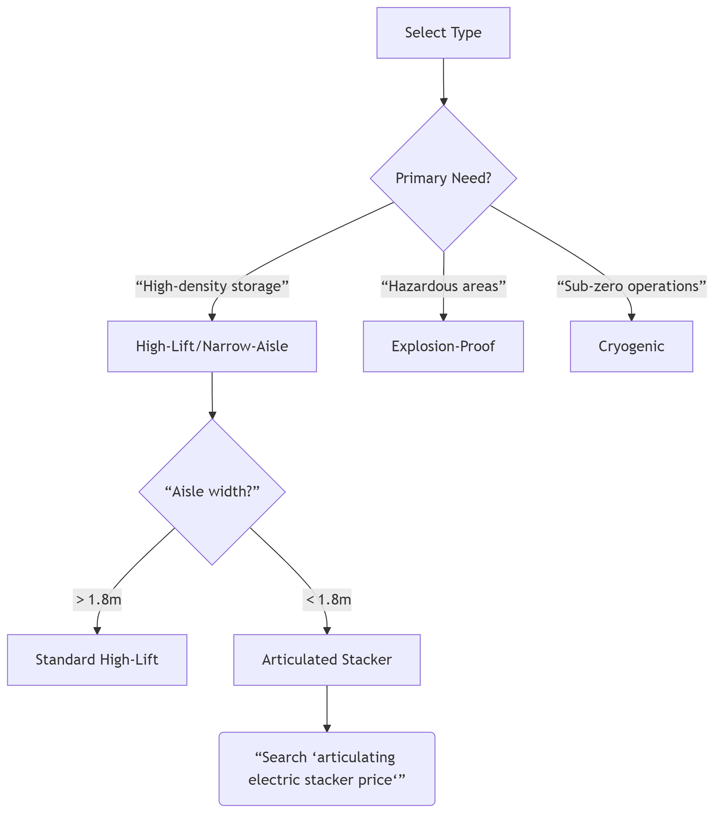 ປະເພດ Aisle Width Target Keyword Tri-Directional 1.6-1.8m "tri-directional electric stacker"Articulated 1.4-1.6m "articulating narrow reach truck"3. Explosion-Proof Electric Pallet Jacks
